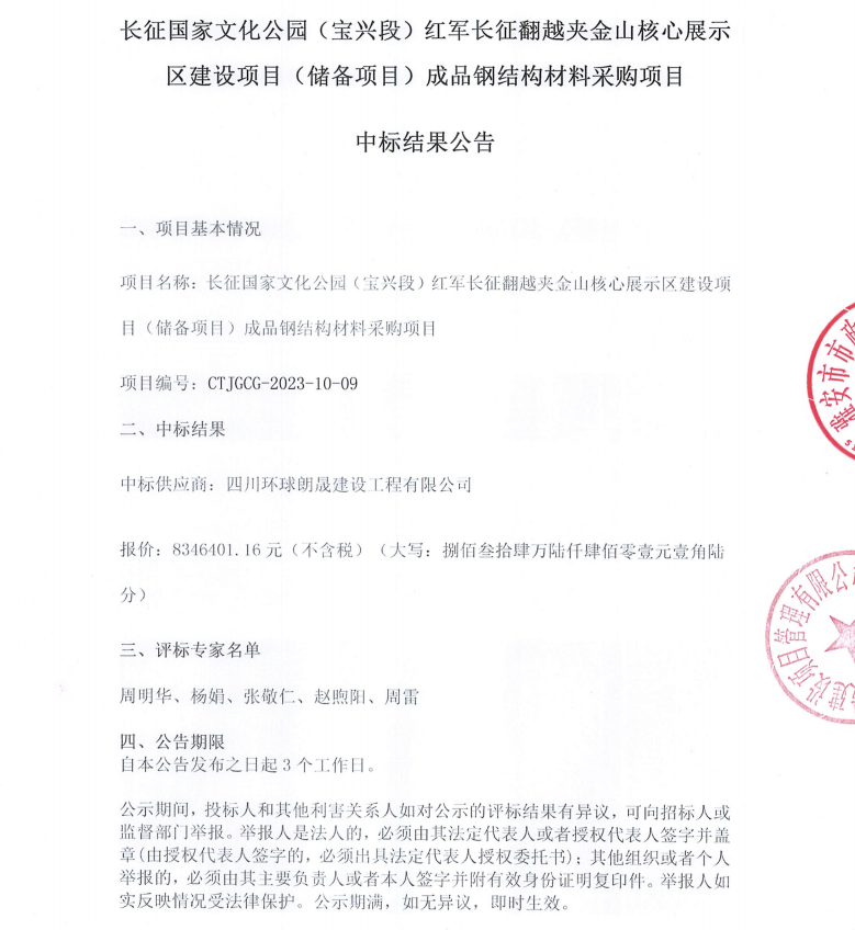 長征國家文化公園(寶興段)紅軍長征翻越夾金山核心展示區(qū)建設(shè)項目(儲備項目)成品鋼結(jié)構(gòu)材料采購項目中標(biāo)結(jié)果公告
