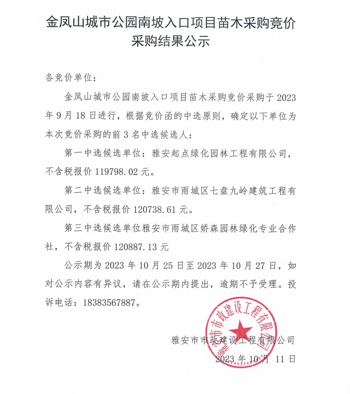 金鳳山城市公園南坡入口項目苗木采購競價采購結(jié)果公示
