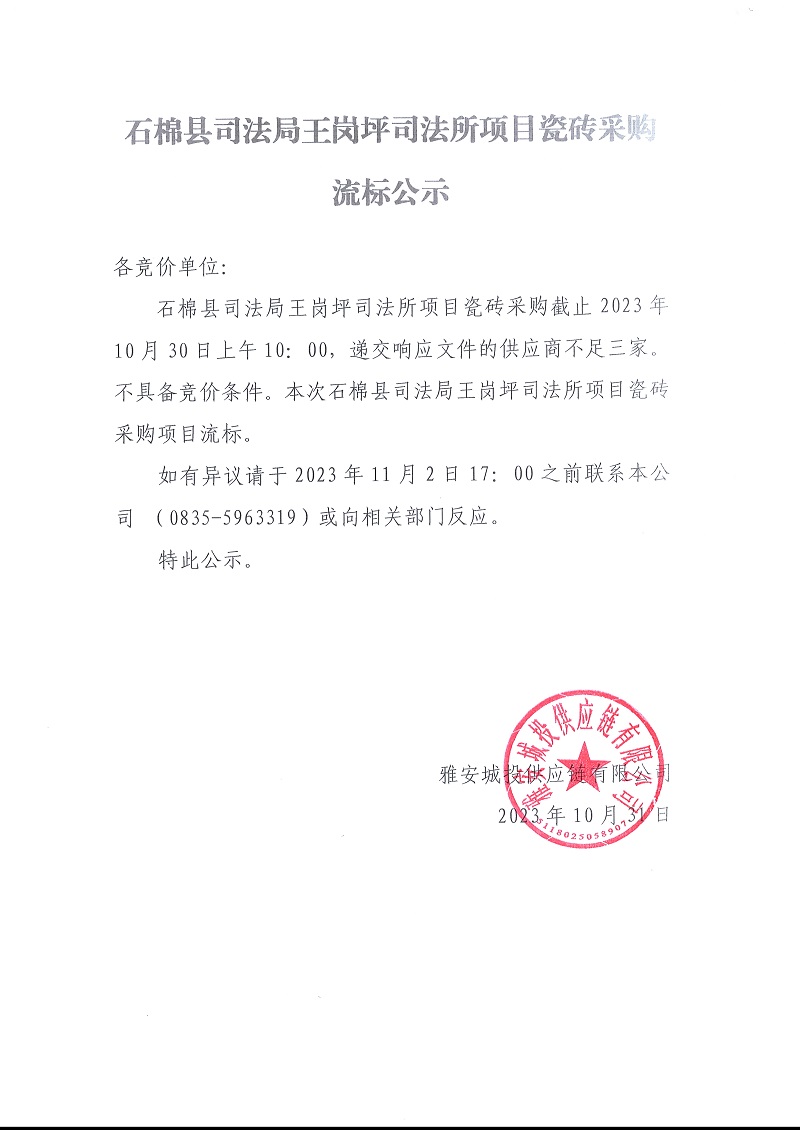 石棉縣司法局王崗坪司法所項(xiàng)目瓷磚采購流標(biāo)公示