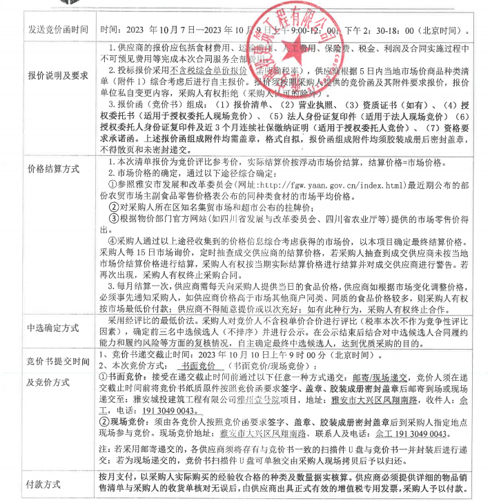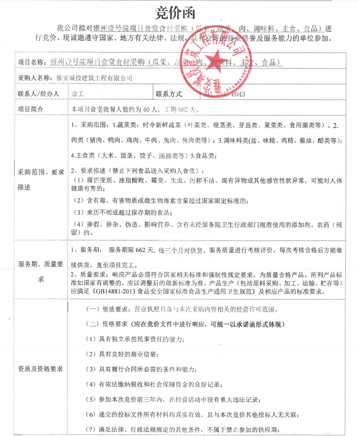 雅州壹號(hào)院項(xiàng)目食堂食材采購(gòu)(瓜果、蔬菜、肉、調(diào)味料、主食、食品)競(jìng)價(jià)公告