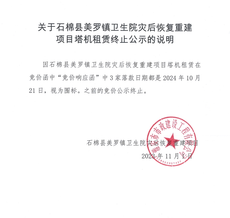 關(guān)于石棉縣美羅鎮(zhèn)衛(wèi)生院災后恢復重建項目塔機租賃終止公示的說明