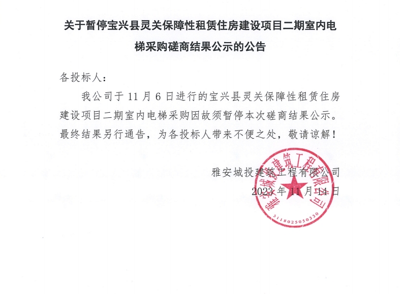 關于暫停寶興縣靈關保障性租賃住房建設項目二期室內電梯采購磋商結果公示的公告