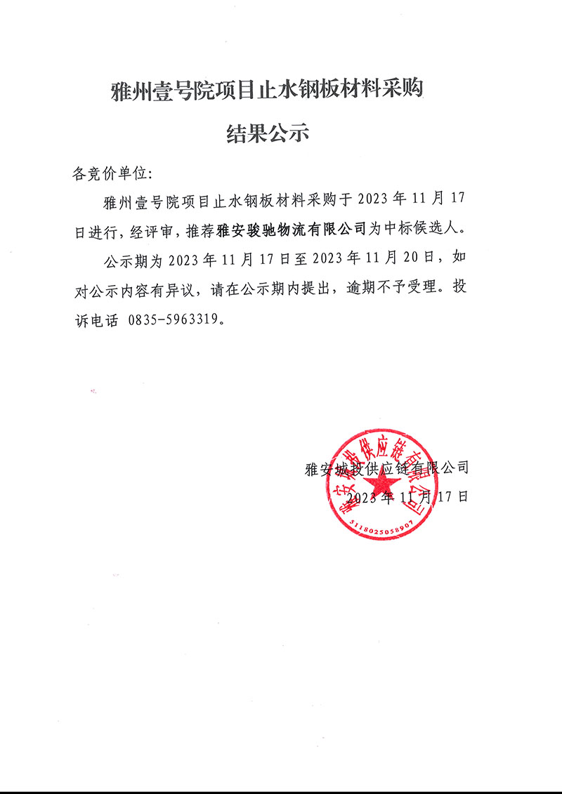 雅州壹號院項目止水鋼板材料采購結果公示