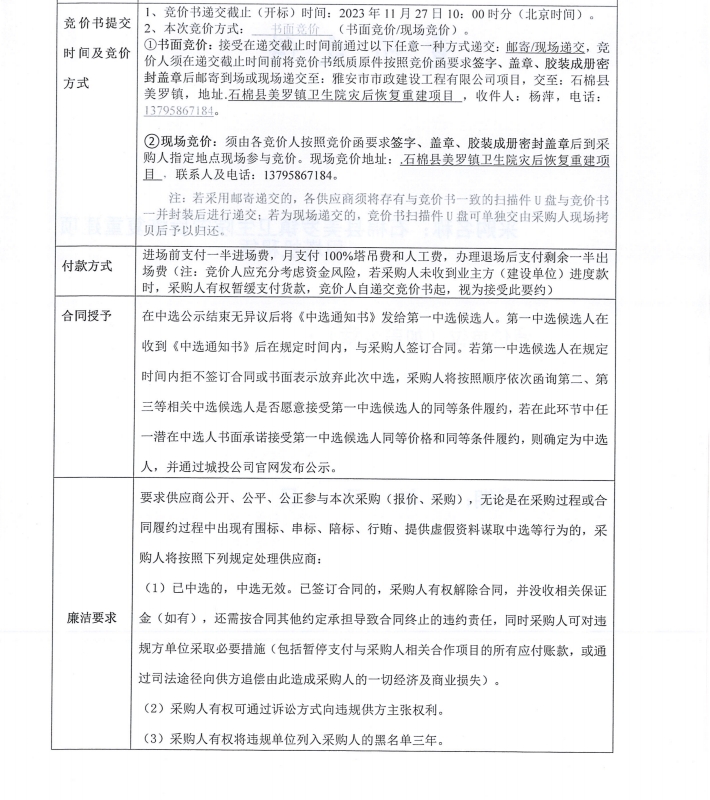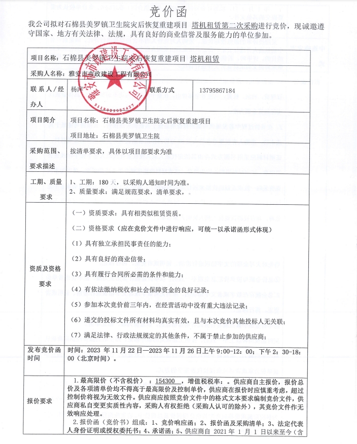 石棉縣美羅鎮(zhèn)衛(wèi)生院災(zāi)后恢復(fù)重建項(xiàng)目塔機(jī)租賃(第二次)采購(gòu)競(jìng)價(jià)公告