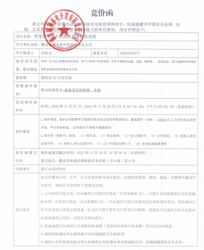 羅家灣電站大壩柴油發(fā)電機(jī)組采購(gòu)競(jìng)價(jià)公告