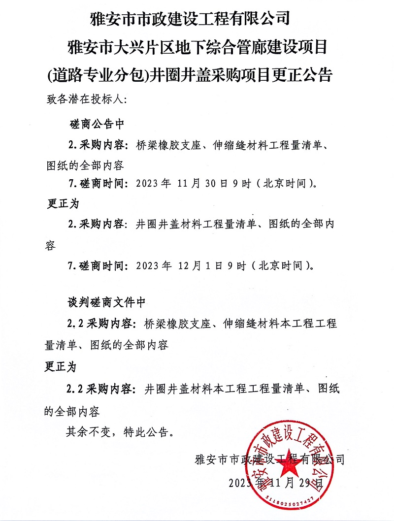雅安市市政建設(shè)工程有限公司雅安市大興片區(qū)地下綜合管廊建設(shè)項(xiàng)目(道路專業(yè)分包)井圈井蓋采購(gòu)項(xiàng)目更正公告