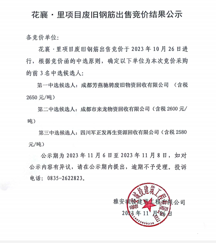 花襄·里廢舊鋼筋出售競價(jià)結(jié)果公示