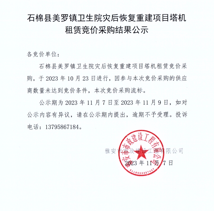 石棉縣美羅鎮(zhèn)衛(wèi)生院災(zāi)后恢復(fù)重建項目塔機租賃競價采購結(jié)果公示
