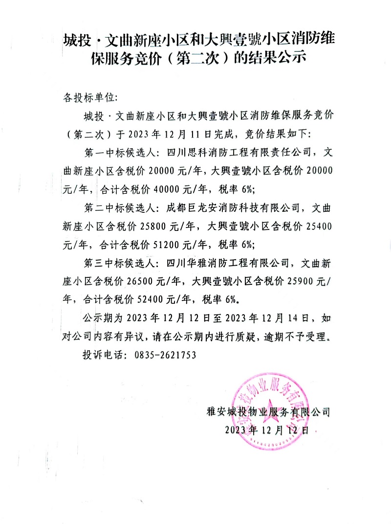 城投·文曲新座小區(qū)和大興壹號(hào)小區(qū)消防維保服務(wù)競(jìng)價(jià)(第二次)的結(jié)果公示