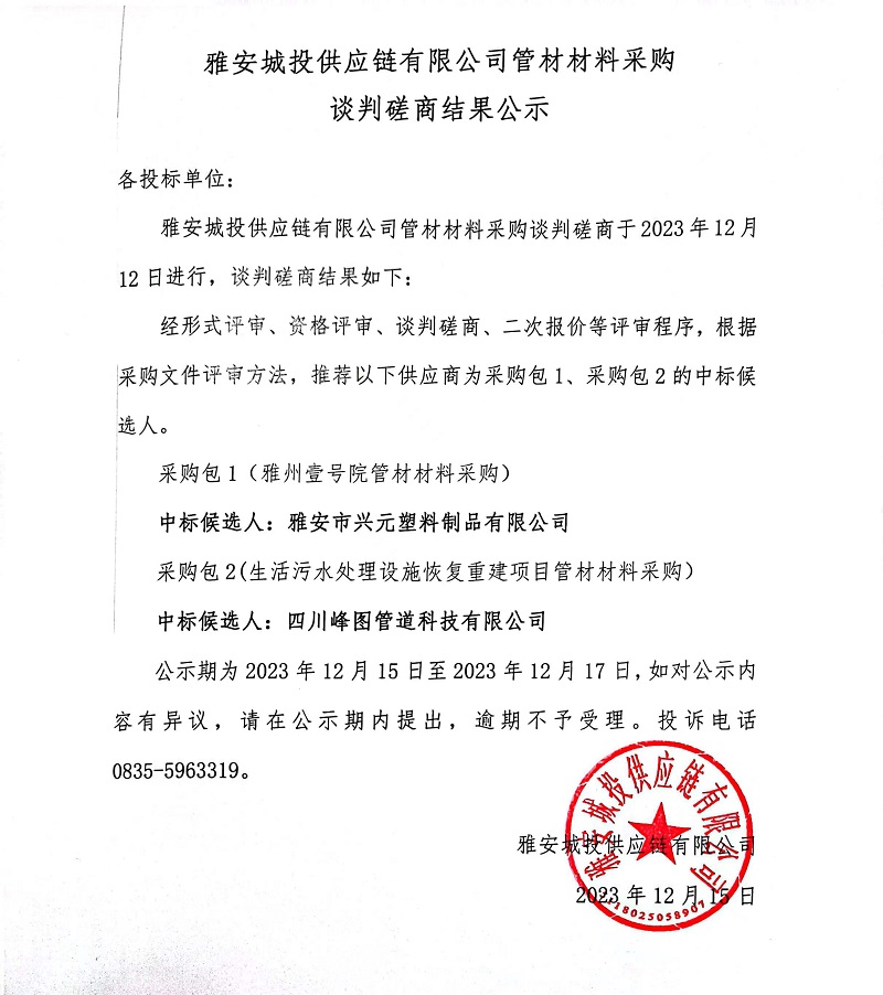 雅安城投供應(yīng)鏈有限公司管材材料采購(gòu)談判磋商結(jié)果公示
