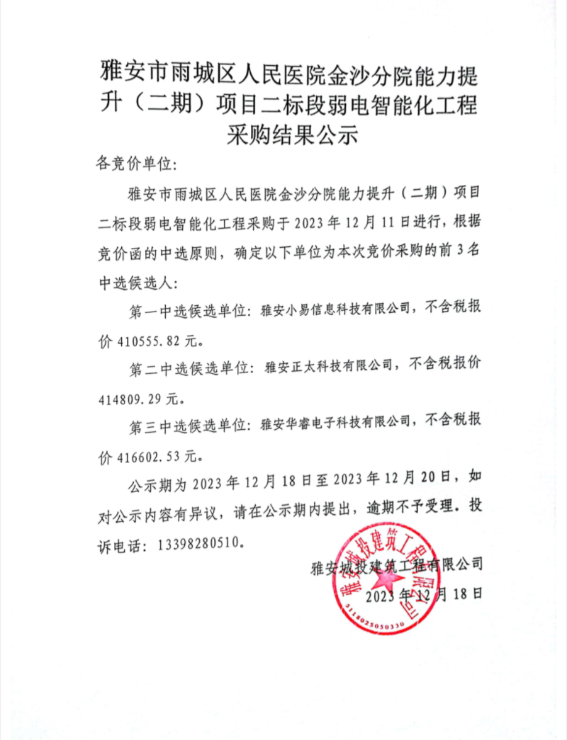 雅安市雨城區(qū)人民醫(yī)院金沙分院能力提升(二期)項目二標(biāo)段弱電智能化工程采購結(jié)果公示