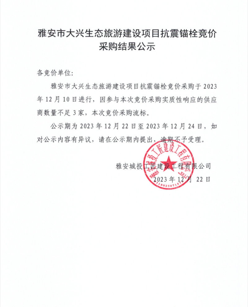 雅安市大興生態(tài)旅游建設(shè)項(xiàng)目抗震錨栓競價(jià)采購結(jié)果公示