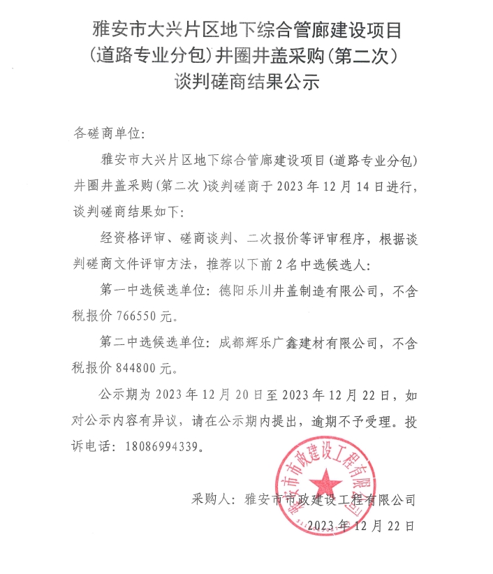 雅安市大興片區(qū)地下綜合管廊建設(shè)項(xiàng)目(道路專(zhuān)業(yè)分包)井圈井蓋采購(gòu)(第二次)談判磋商結(jié)果公示