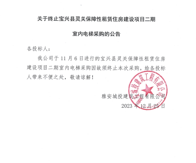 關于終止寶興縣靈關保障性租賃住房建設項目二期室內電梯采購的公告