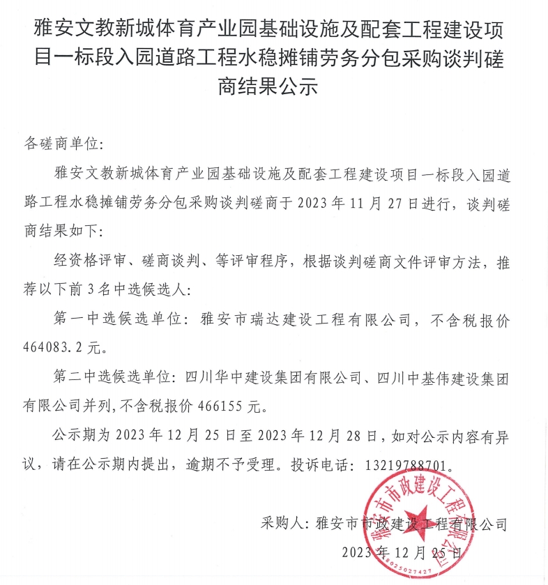 雅安文教新城體育產業(yè)園基礎設施及配套工程建設項目一標段入園道路工程水穩(wěn)攤鋪勞務采購談判磋商結果公示