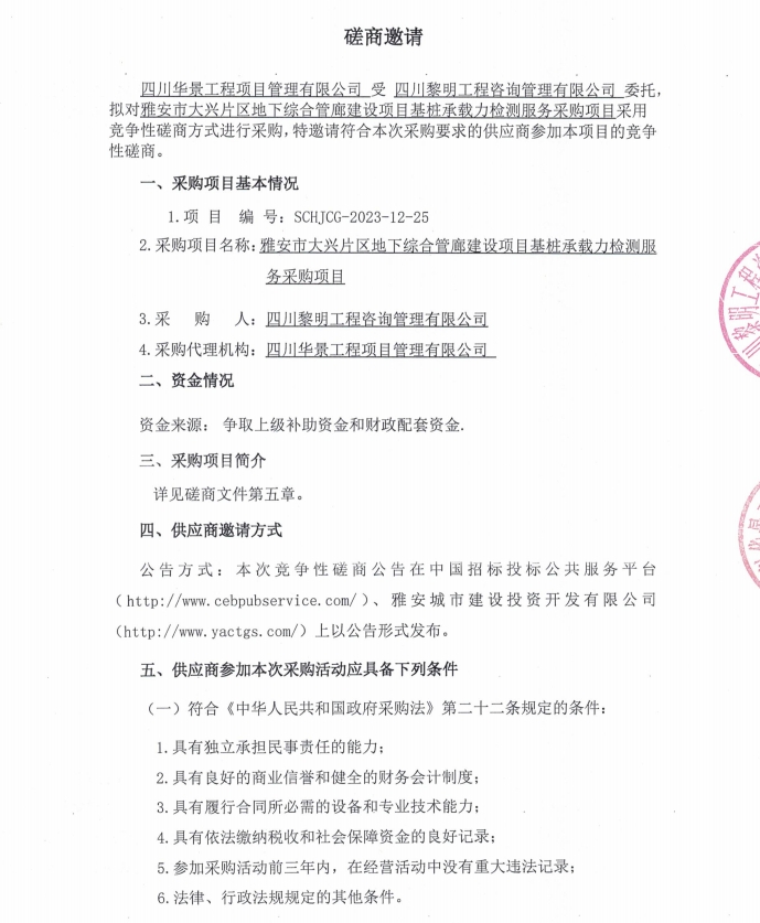 雅安市大興片區(qū)地下綜合管廊建設(shè)項目基樁承載力檢測服務(wù)采購項目磋商邀請公告
