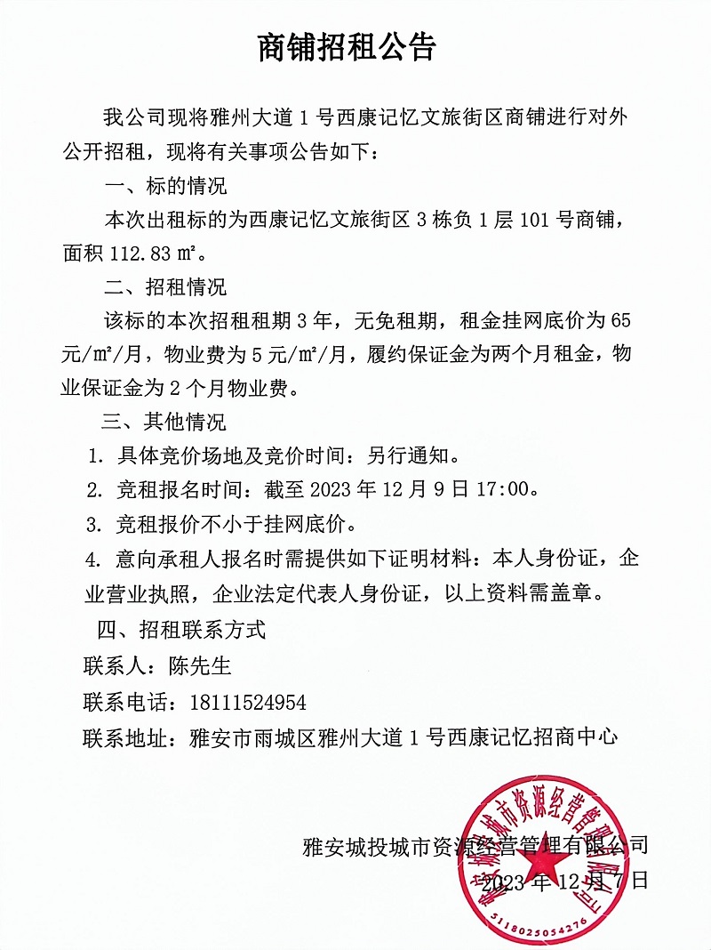 雅州大道1號西康記憶文旅街區(qū)3棟負1層101號商鋪招租公告