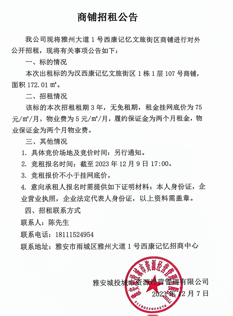 雅州大道1號西康記憶文旅街區(qū)1棟1層107號商鋪招租公告