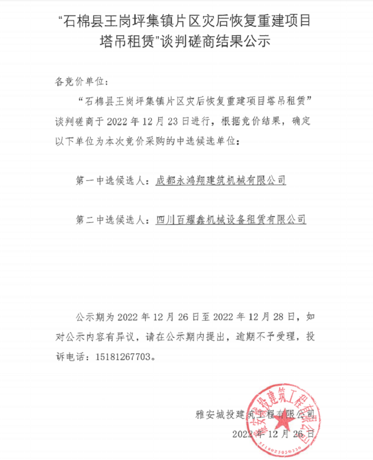 “石棉縣王崗坪集鎮(zhèn)片區(qū)災后恢復重建項目塔吊租賃”談判磋商結果公示