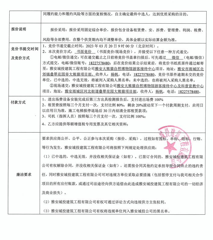 雅安大熊貓自然博物館游客接待中心及科普宣教中心項(xiàng)目施工升降機(jī)租賃采購競價公告