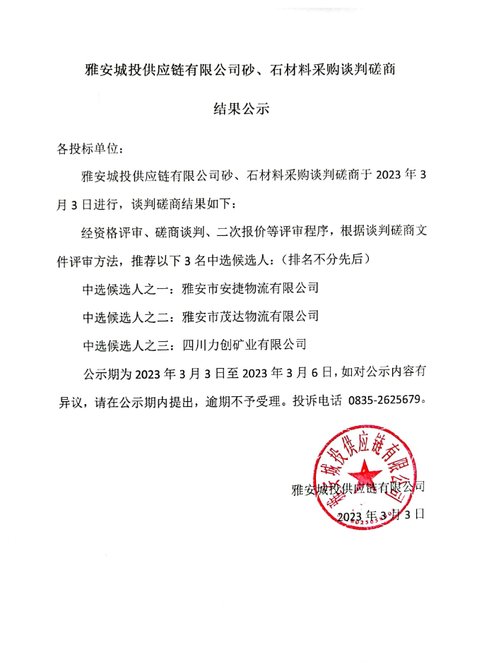 雅安城投供應(yīng)鏈有限公司砂、石材料采購談判磋商結(jié)果公示