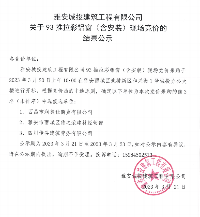 雅安城投建筑工程有限公司關(guān)于93推拉彩鋁窗(含安裝)現(xiàn)場(chǎng)競(jìng)價(jià)的結(jié)果公示