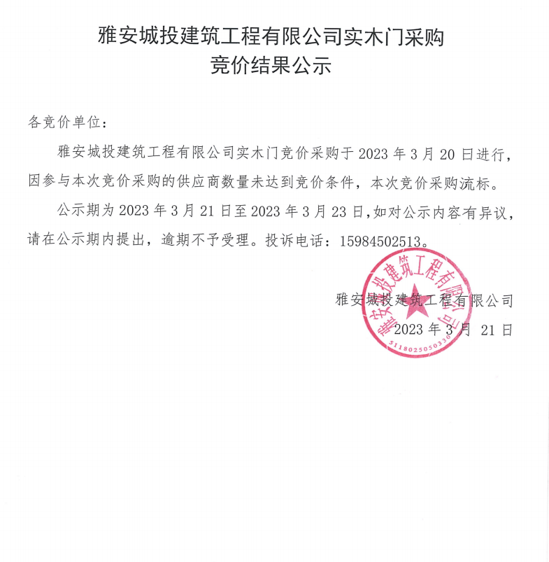 雅安城投建筑工程有限公司實(shí)木門(mén)采購(gòu)競(jìng)價(jià)結(jié)果公示
