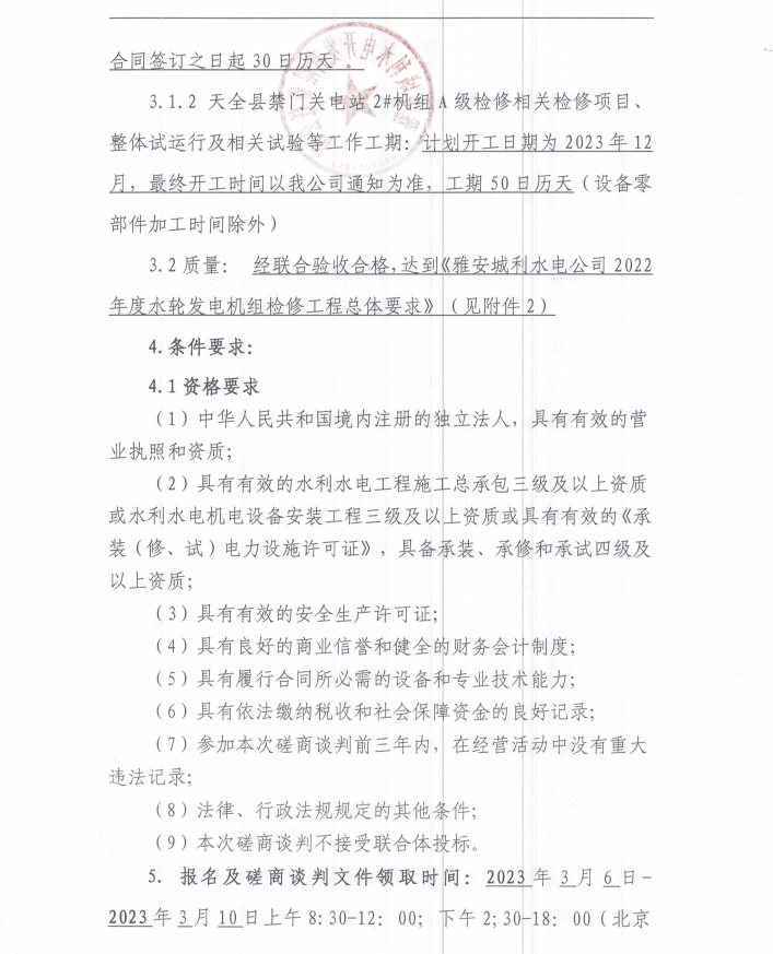 雅安城利水電公司2022年度水輪發(fā)電機(jī)組檢修工程(第三次)磋商談判公告