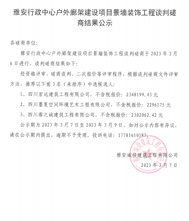 雅安行政中心戶外廊架建設項目景墻裝飾工程談判磋商結果公示