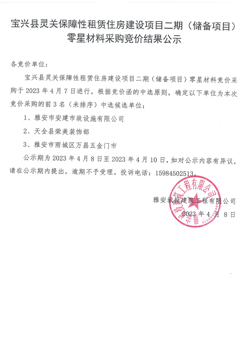 寶興縣靈關保障性租賃住房建設項目二期(儲備項目)零星材料采購競價結果公示