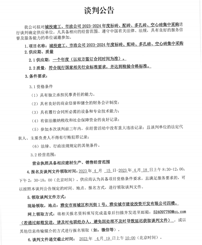 城投建工、市政公司2023-2024年度標(biāo)磚、配磚、多孔磚、空心磚集中采購(gòu)談判公告