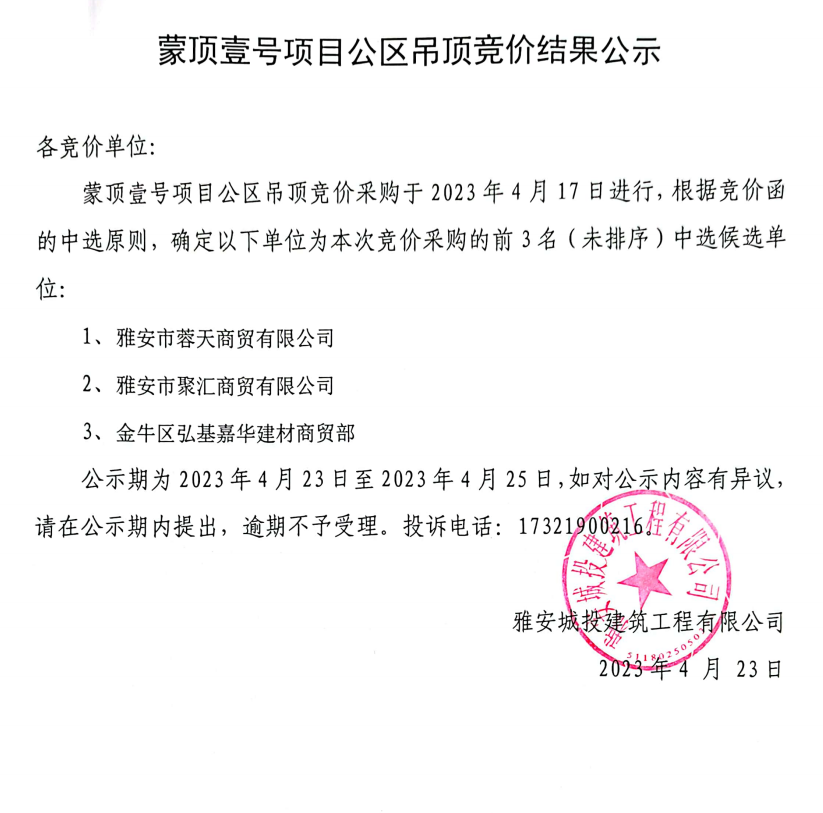 蒙頂壹號(hào)項(xiàng)目公區(qū)吊頂競價(jià)結(jié)果公示