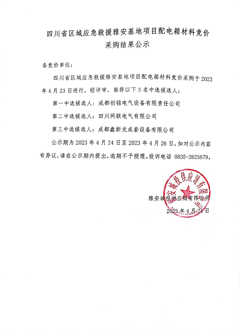 四川省區(qū)域應(yīng)急救援雅安基地項目配電箱材料競價采購結(jié)果公示
