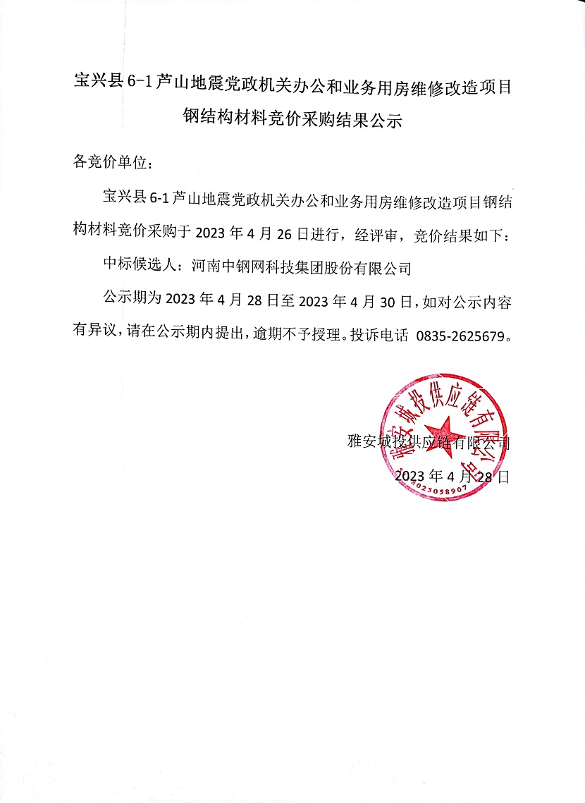 寶興縣6-1蘆山地震黨政機(jī)關(guān)辦公和業(yè)務(wù)用房維修改造項(xiàng)目鋼結(jié)構(gòu)材料競價采購結(jié)果公示