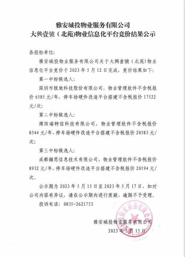 大興壹號(北苑)物業(yè)信息化平臺競價結(jié)果公示