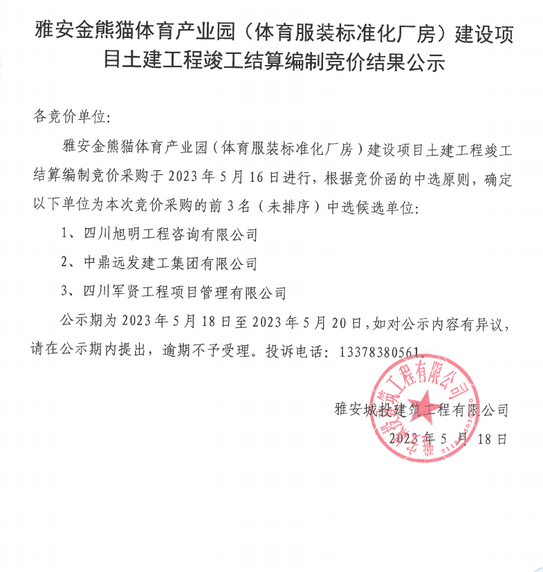 雅安金熊貓?bào)w育產(chǎn)業(yè)園(體育服裝標(biāo)準(zhǔn)化廠(chǎng)房)建設(shè)項(xiàng)目土建工程竣工結(jié)算編制競(jìng)價(jià)結(jié)果公示