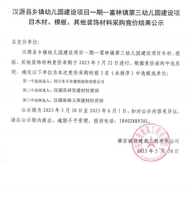 漢源縣鄉(xiāng)鎮(zhèn)幼兒園建設(shè)項目一期--富林鎮(zhèn)第三幼兒園建設(shè)項目木材、模板、其他裝飾材料采購競價結(jié)果公示