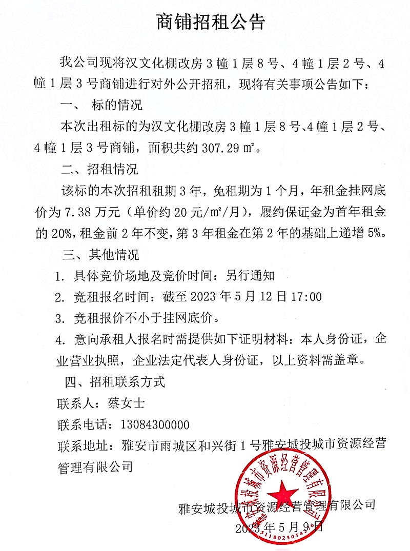 漢文化棚改房3幢1層8號、4幢1層2號、4幢1層3號商鋪招租公告