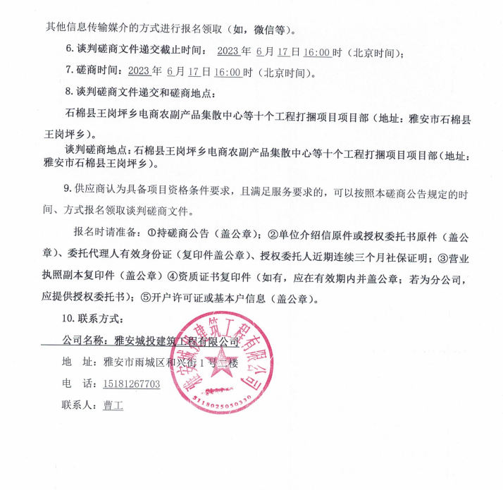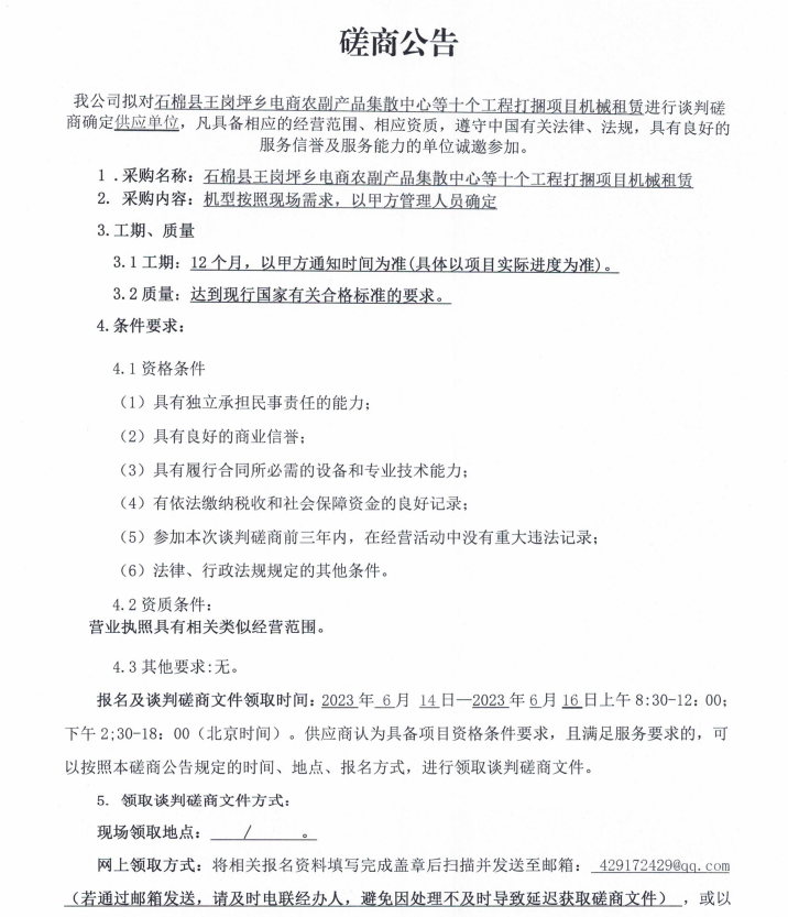 石棉縣王崗坪鄉(xiāng)電商農(nóng)副產(chǎn)品集散中心等十個工程打捆項目機(jī)械租賃談判磋商公告