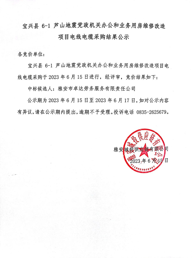 寶興縣 6-1 蘆山地震黨政機(jī)關(guān)辦公和業(yè)務(wù)用房維修改造項(xiàng)目電線電纜采購(gòu)結(jié)果公示