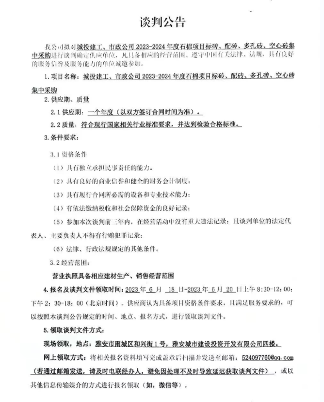城投建工、市政公司2023-2024年度石棉項目標(biāo)磚、配磚、多孔磚、空心磚集中采購談判公告