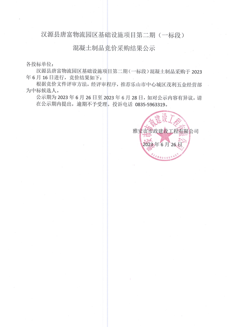 漢源縣唐富物流園區(qū)基礎設施項目第二期 (一標段)混凝土制品采購競價結果公示