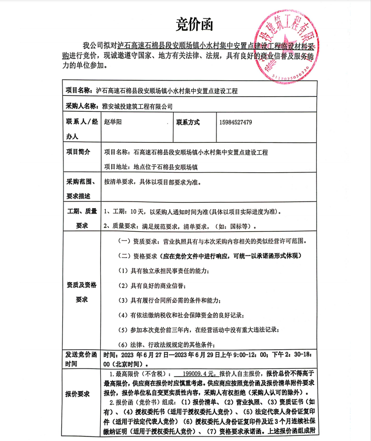 瀘石高速石棉縣段安順場(chǎng)鎮(zhèn)小水村集中安置點(diǎn)建設(shè)工程臨設(shè)材料采購(gòu)競(jìng)價(jià)公告