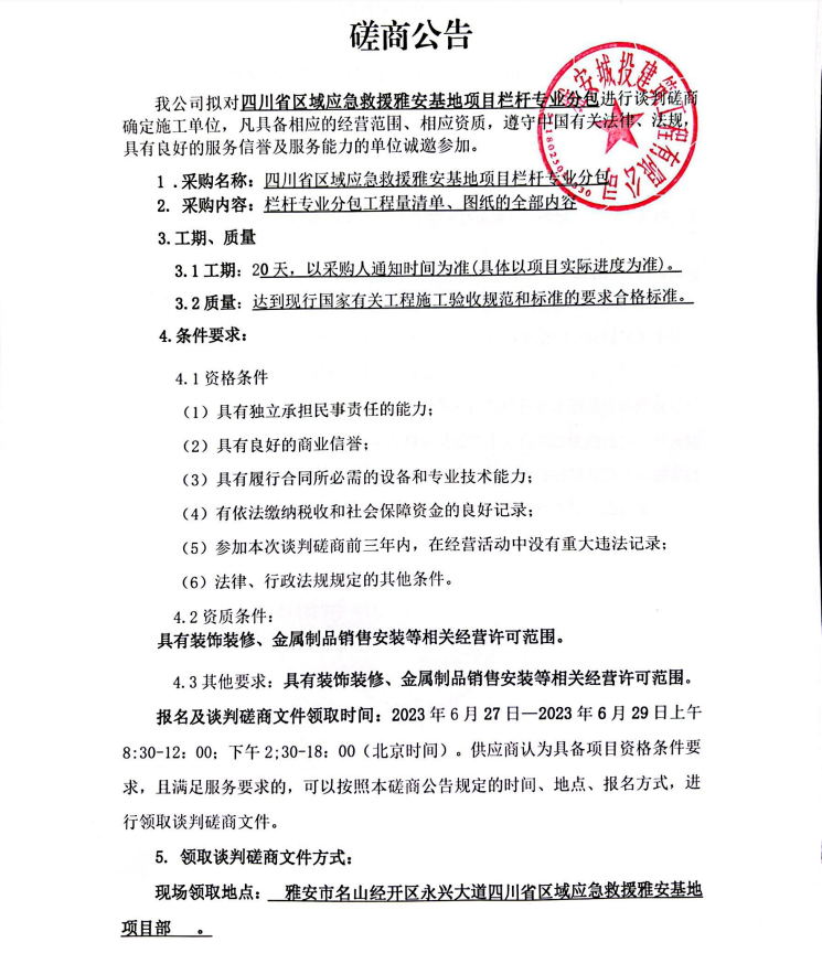四川省區(qū)域應(yīng)急救援雅安基地項目欄桿專業(yè)分包談判磋商公告