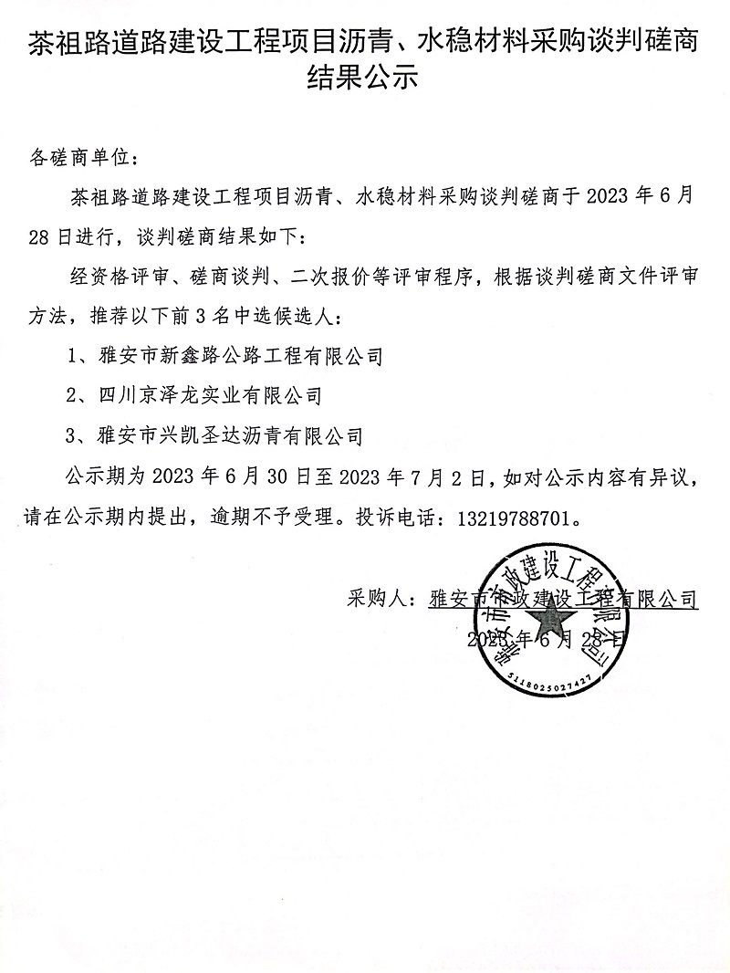 茶祖路道路建設工程瀝青、水穩(wěn)采購談判磋商結果公示