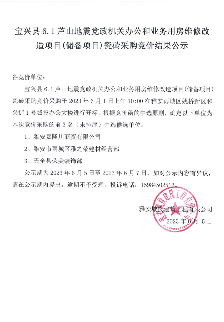 寶興縣6.1蘆山地震黨政機關辦公和業(yè)務用房維修改造項目(儲備項目)瓷磚采購競價結(jié)果公示