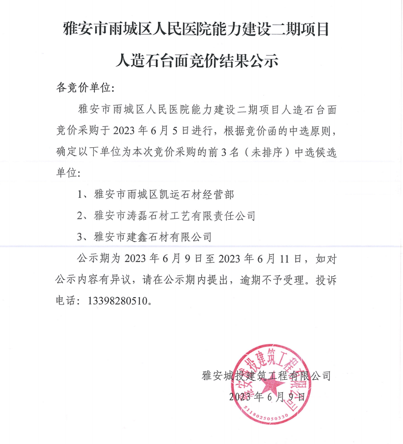 雅安市雨城區(qū)人民醫(yī)院能力建設(shè)二期項(xiàng)目人造石臺(tái)面競價(jià)結(jié)果公示