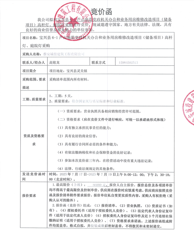 寶興縣6-1蘆山地震黨政機(jī)關(guān)辦公和業(yè)務(wù)用房維修改造項目(儲備項目)高桿燈、庭院燈采購競價公告