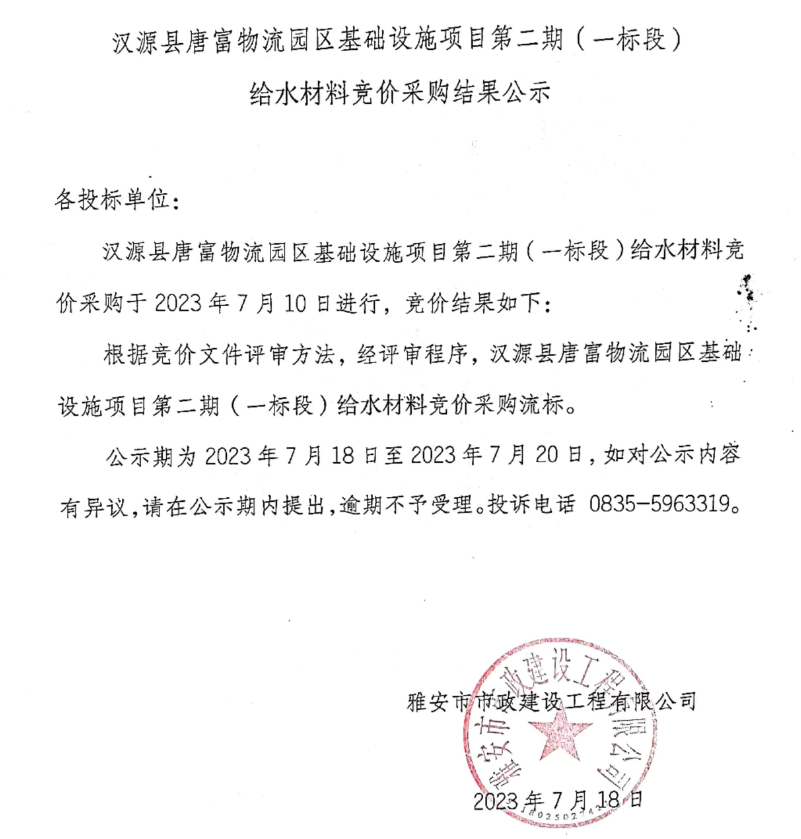 漢源縣唐富物流園區(qū)基礎設施項目二期(一標段)給水材料競價采購結果公示