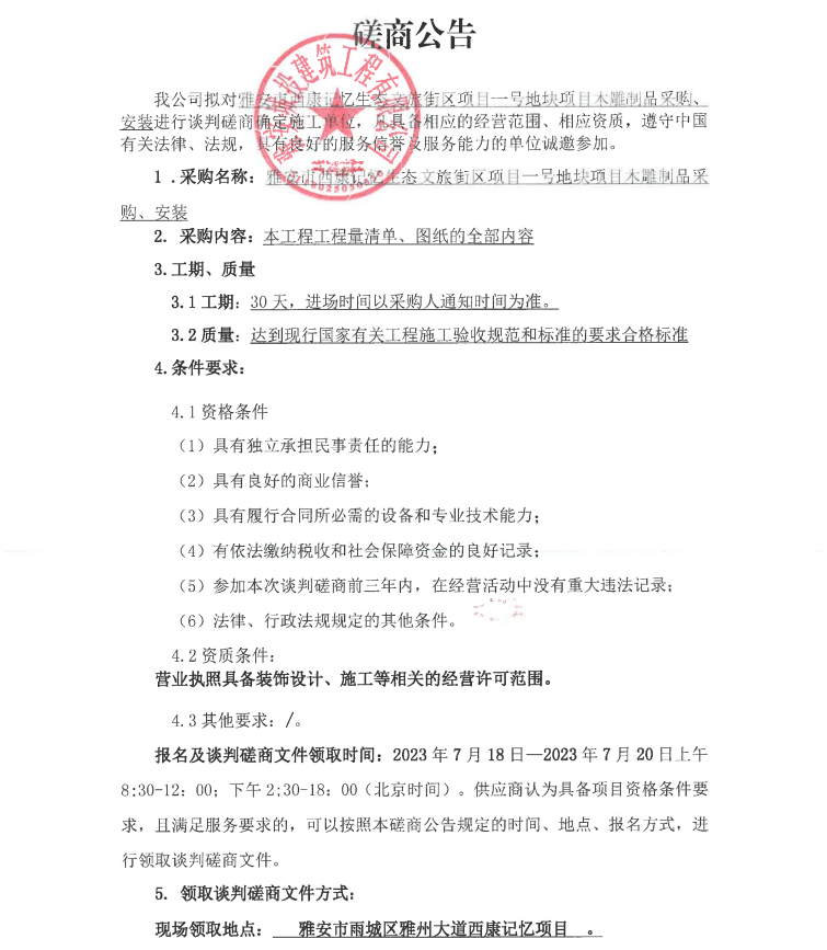 雅安市西康記憶生態(tài)文旅街區(qū)項(xiàng)目一號(hào)地塊項(xiàng)目木雕制品采購、安裝談判磋商公告